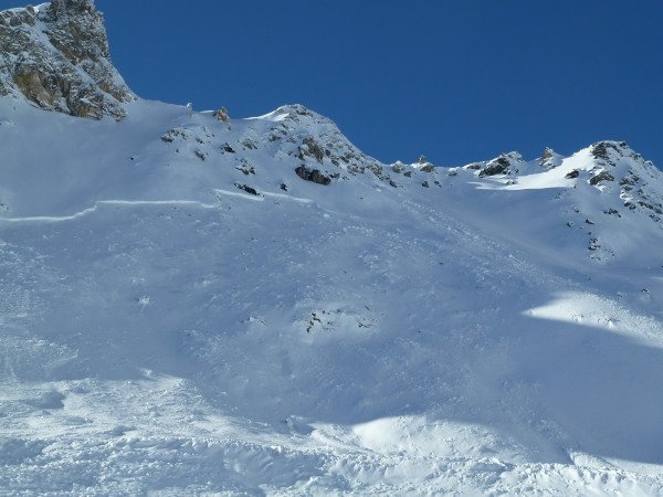 It looks like great conditions for the Christmas holidays. Perfect pistes and some more fresh snow today means there's good off piste too. Evolene is open, and Arolla yesterday was excellent. Expecting crust after Thursday's rain we set off for some skinning exercise only to find more excellent powder - Arolla is high enough to have been above the rain level. There's still plenty of unstable snow, so lots of care needed off piste. This huge full-depth avalanche is just one of many...