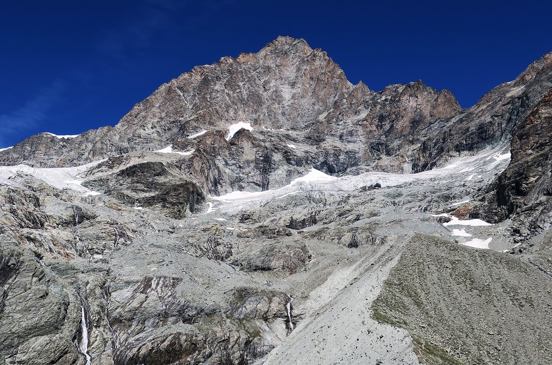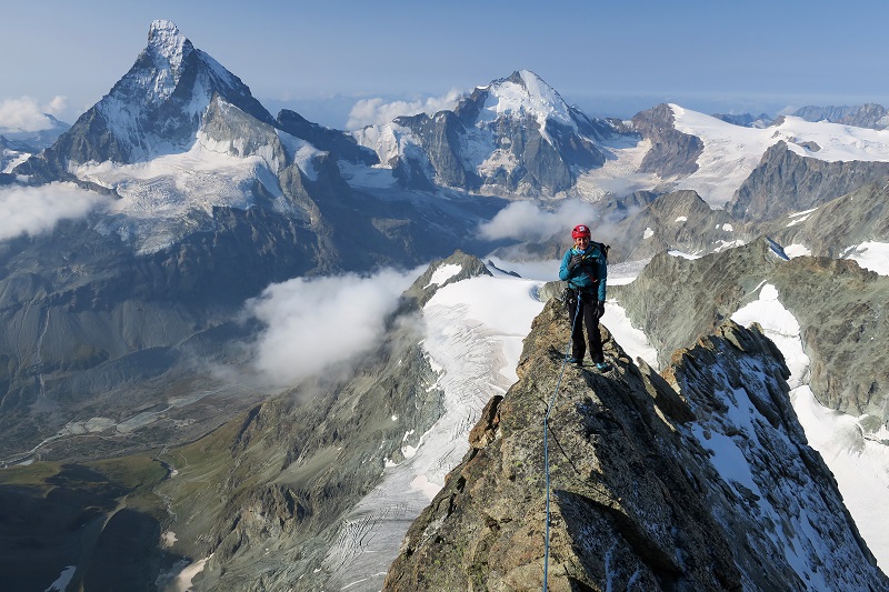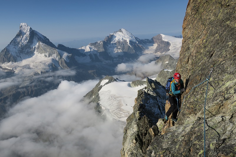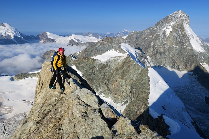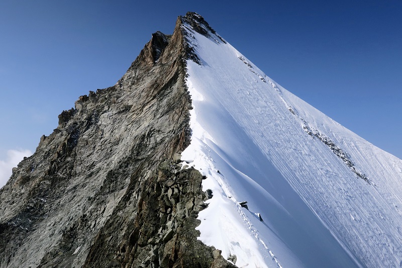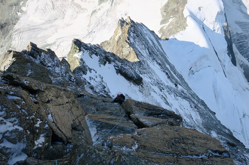 The Obergabelhorn has 2 very different sides - a huge, snowy North face and a steep cliff of red rock to the South. The fine West-East ridge that splits the two faces is one of the finest ridge traverses in the Alps with a steep ridge of solid gneiss on the West and a fine, airy, mixed ridge dropping East off the summit before climbing back over the Wellenkuppe and down the glacier to the Rothorn hut.