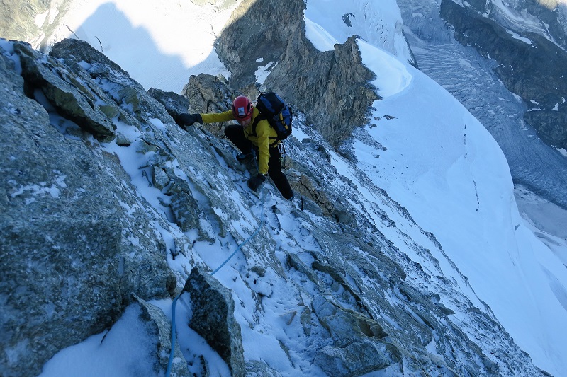 The 4000m peaks guidebook says the ridge is "best climbed when dry and snow-free" - that's good advice, but the evening storms had left a thin dusting of snow which made the climbing quite awkward!