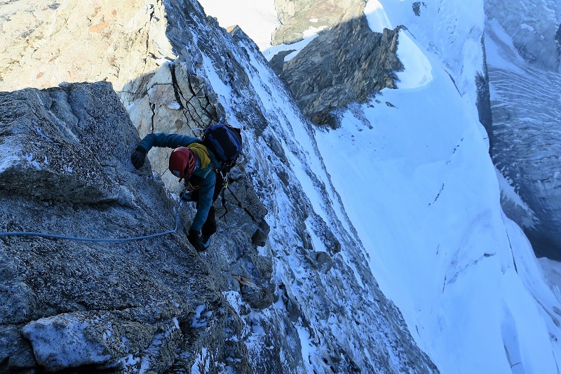The summit is only halfway there! Descending the East ridge isn't easy, needing careful down-climbing and some abseils on steep, mixed ground with the huge drop of the North face below.
