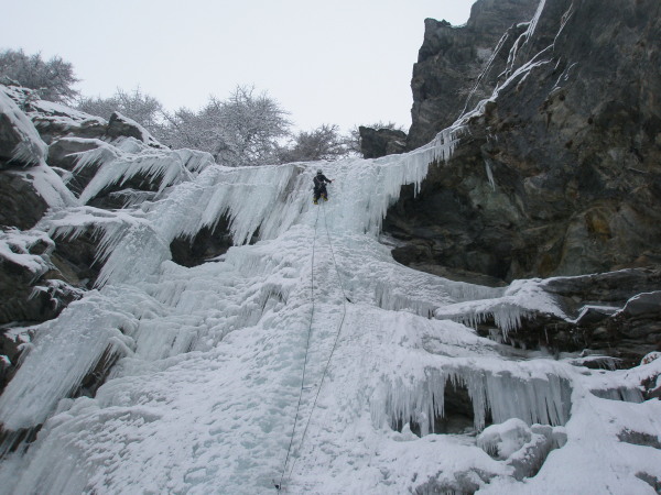 Next it was the slog up to the Coop Icefall - much further than it looks. This is called the Grande cascade d'Evolene in the guidebook and it's directly above the Coop and well visible from the town. 2 big pitches with a choice of grade 3 or 4+ on pitch 1. We went up the 4+ pillar which is in good condition. Some new belay bolts have appeared since last year which makes life easier. Pitch 2 is a great pitch of 4, and it's 2 easy abseils back to the bottom. Then a very fast bumslide through the trees - highlight of the day!