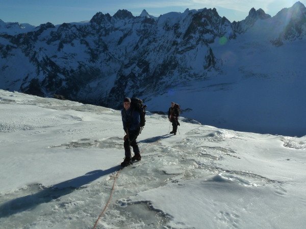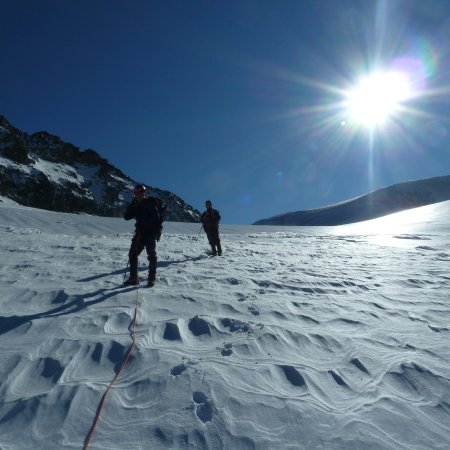 It was cold and hard going in deep snow up the glacier de Pieces to the Vignettes but the new winter room is excellent and very confortable. We were gambling on finding better conditions on the "sunny" side - and it was a relief to find them - firm snow and well bridged crevasses. Luckily the firm snow lasted most of the way to the Dix hut. This side is much more open, but still manageable.