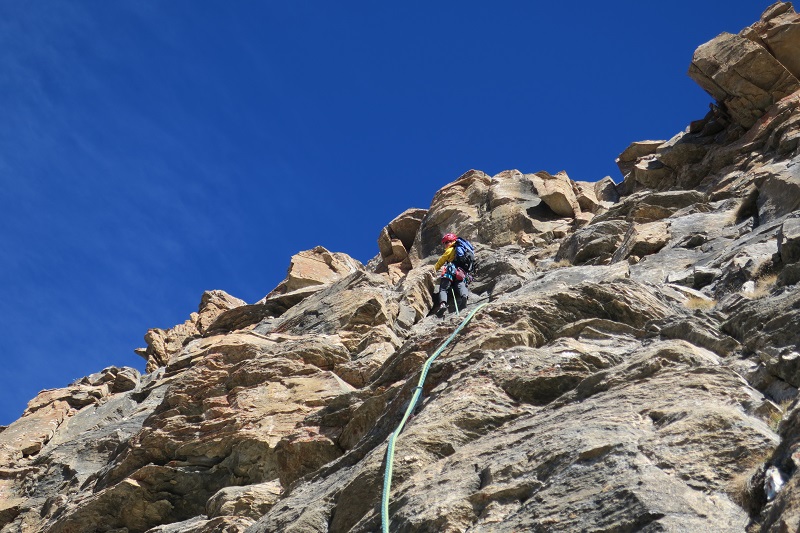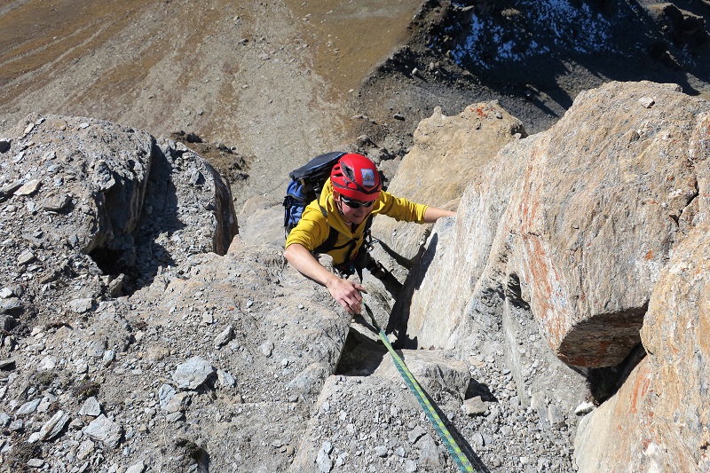 La Maya is the prominent tooth of red rock on the ridge separating the Val d'Hérens from the Vallon de Réchy. (I'm not sure what a "Maya" is, but there are several of them around). From a distance it looks like a huge monolith of Torridonian sandstone - close up it's somewhat smaller and looser, but still good fun with fine views and pretty much guaranteed peace and quiet. It's difficult to know where this sort of climbing sits in the 21st century pigeonholes - maybe a new category of "adventure-plaisir"? It's well bolted, generously over-graded at 5b, but quite a few of the holds might break off!