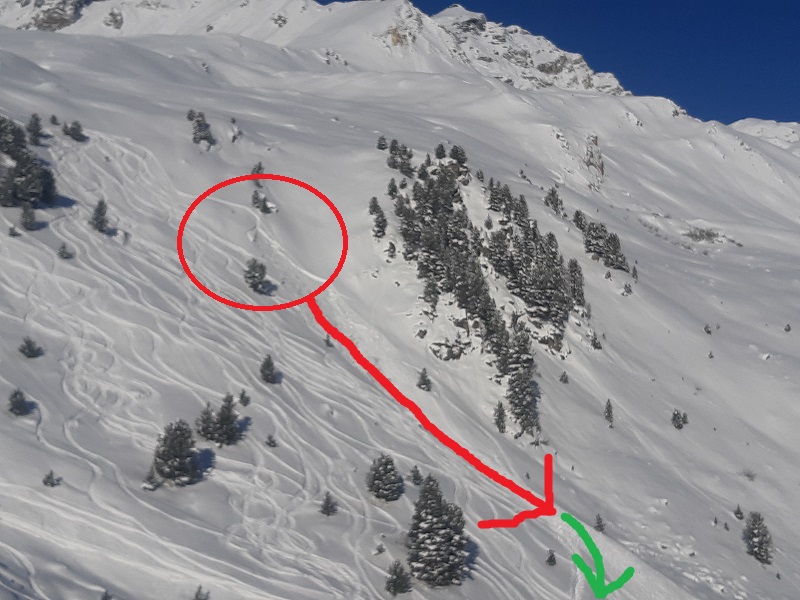 Avalanche conditions were bad because of the thin snowpack - here's a lucky escape on a sunny Saturday in Arolla. The classic trap of skiing fresh tracks next to the piste, then spreading out across the steepening slope until it got too steep. A small slab, but enough to carry the skier 150m downhill and bury his skis. The green line marks his ski-less walk out!